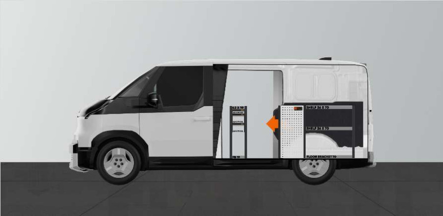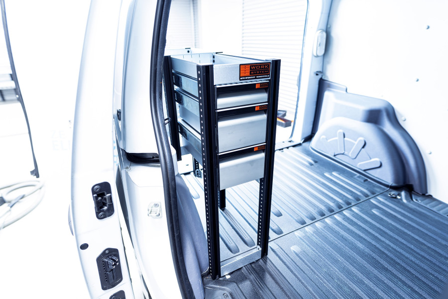 Voulez vous optimiser votre Kia PV5 L2H1avec un aménagement supplémentaire ? Cet aménagement utilitaire vous permet de compléter votre espace de rangement tout en gardant un espace de chargement central maximal, grâce sa faible profondeur de seulement 260 mm. L’aménagement dispose de trois tiroirs de différentes tailles afin de varier les possibilités de rangement. Les tiroirs s’ouvrent facilement depuis la porte latérale coulissante et peuvent supporter une charge uniforme de 35 kg / tiroir. L’espace étagère derrière le bloc tiroir est idéal pour ranger vos mallettes, outils ou consommables mais peut aussi se compléter avec notre système de bacs de rangement sur rails.