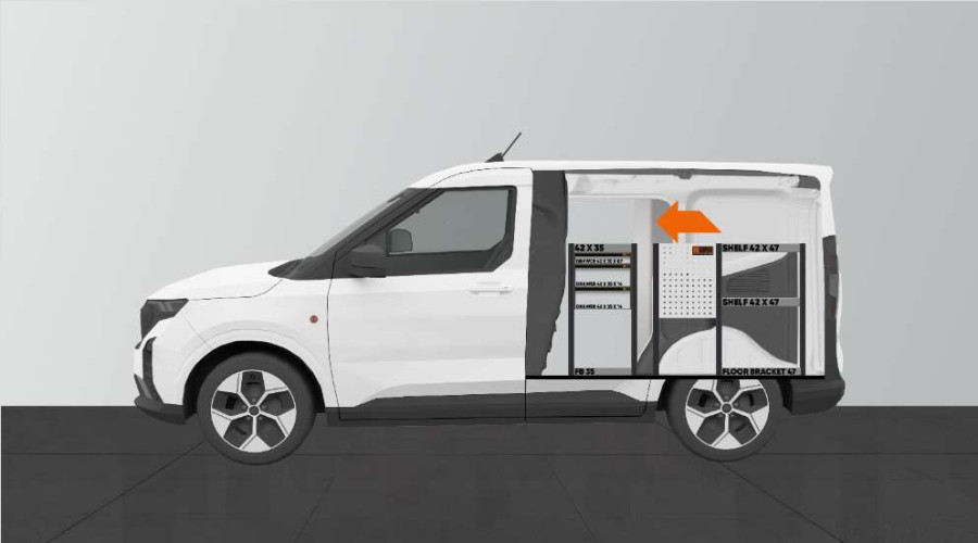 L'un des aménagements les plus populaires pour votre Ford Courier L1. L’aménagement avec une profondeur de 420 mm dispose de trois tiroirs de différentes tailles afin de varier les possibilités de rangement. Les tiroirs s’ouvrent facilement depuis la porte latérale coulissante et peuvent supporter une charge uniforme de 35 kg / tiroir. L’espace étagère derrière le bloc tiroir est idéal pour ranger vos mallettes, outils ou consommables mais peut aussi se compléter avec notre système de bacs de rangement sur rails