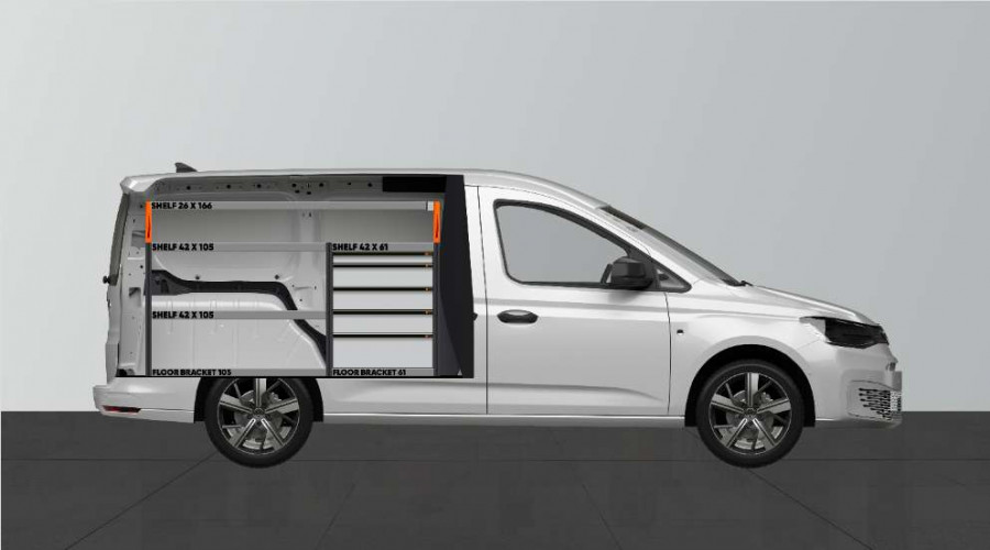 Cet aménagement offre un grand espace de rangement (tiroirs et étagères) pour VW Caddy Cargo & Ford Connect L2 avec porte latérale gauche.