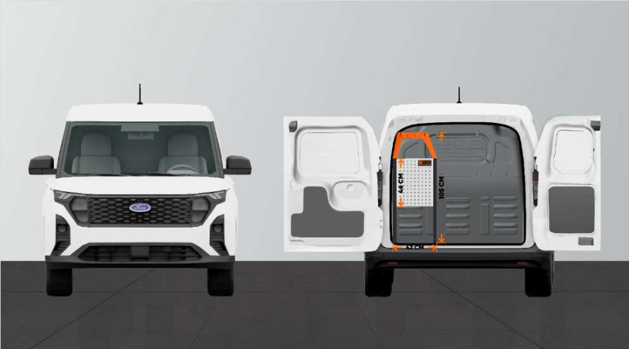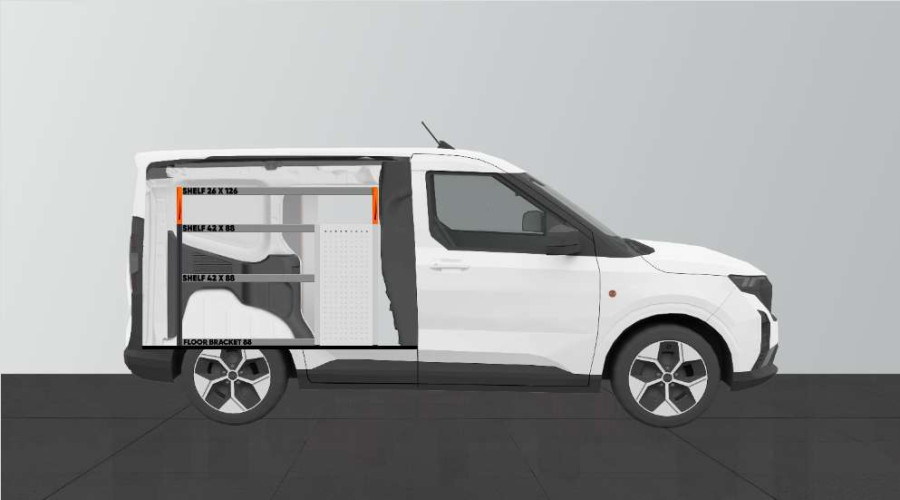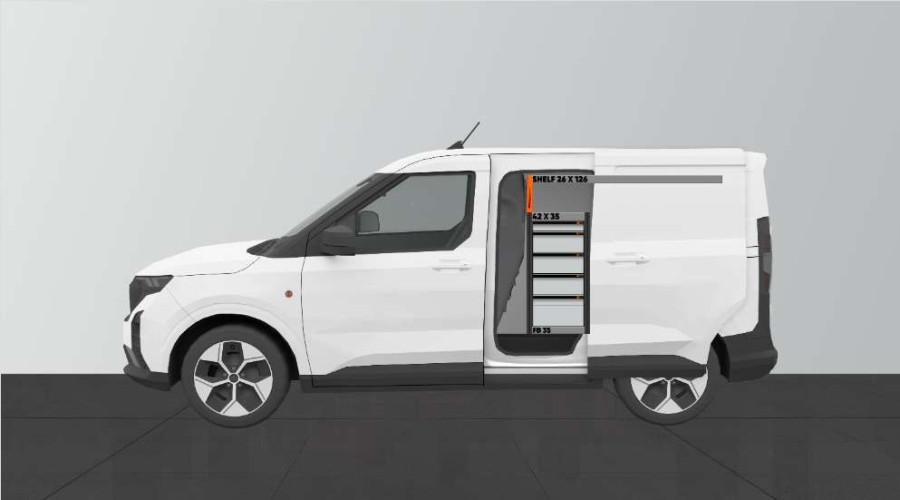 Cet aménagement offre un grand espace de rangement (tiroirs et étagères) pour Ford Courier L1 avec porte latérale gauche.