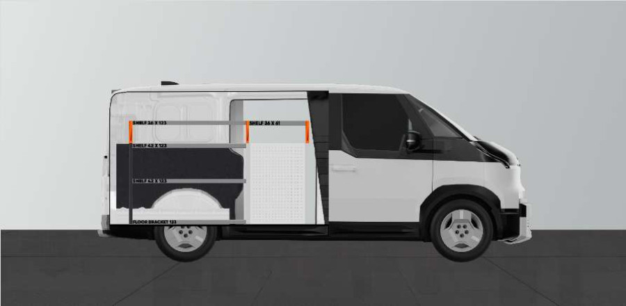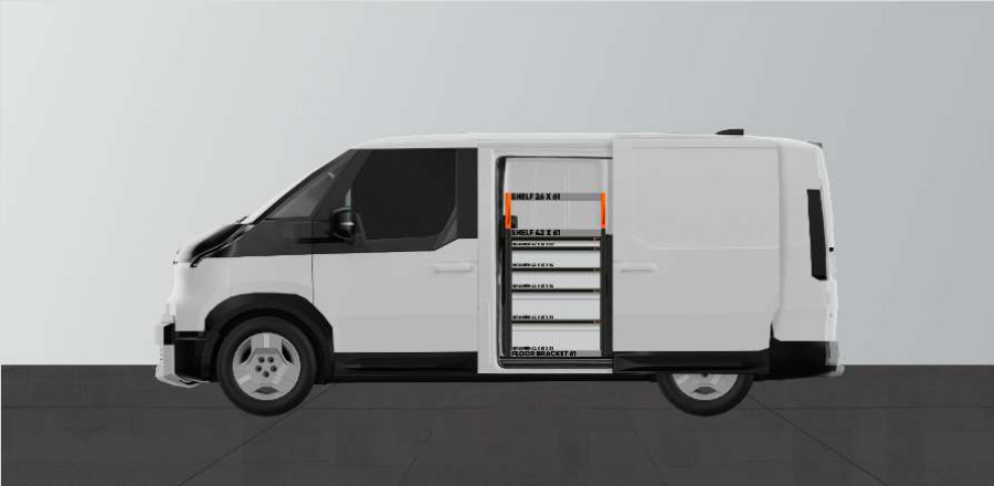 Cet aménagement offre un grand espace de rangement (tiroirs et étagères) pour Kia PV5 L2H1 avec porte latérale gauche.