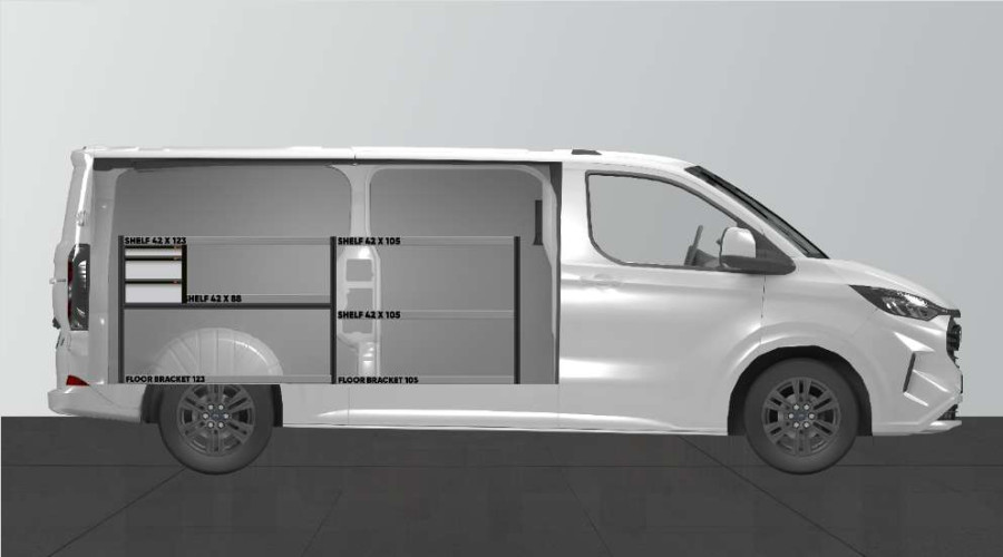 Une solution d’aménagement simple avec tiroirs et étagères pour Ford Custom & VW Transporter L2 très populaire auprès des conducteurs de véhicule de maintenance.