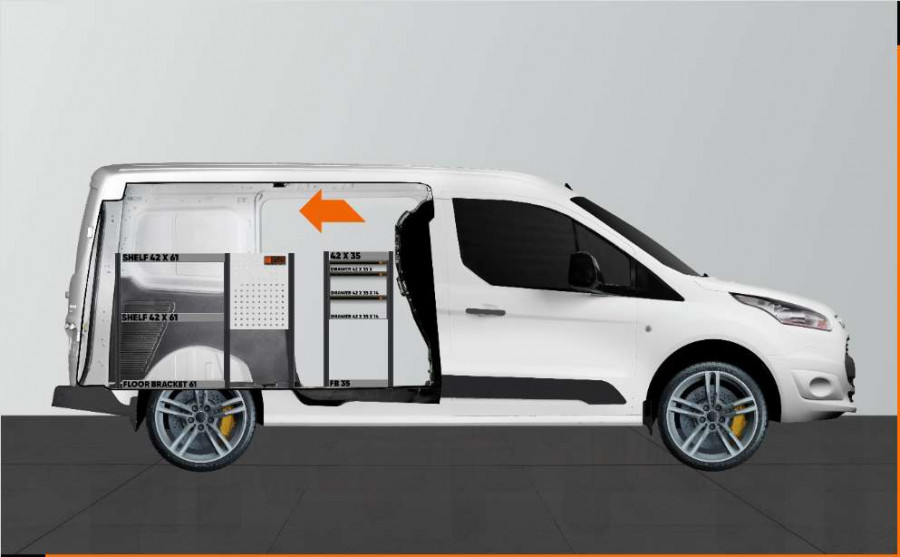 L'un des aménagements les plus populaires pour votre Ford Connect L2. L’aménagement avec une profondeur de 420 mm dispose de trois tiroirs de différentes tailles afin de varier les possibilités de rangement. Les tiroirs s’ouvrent facilement depuis la porte latérale coulissante et peuvent supporter une charge uniforme de 35 kg / tiroir. L’espace étagère derrière le bloc tiroir est idéal pour ranger vos mallettes, outils ou consommables mais peut aussi se compléter avec notre système de bacs de rangement sur rails