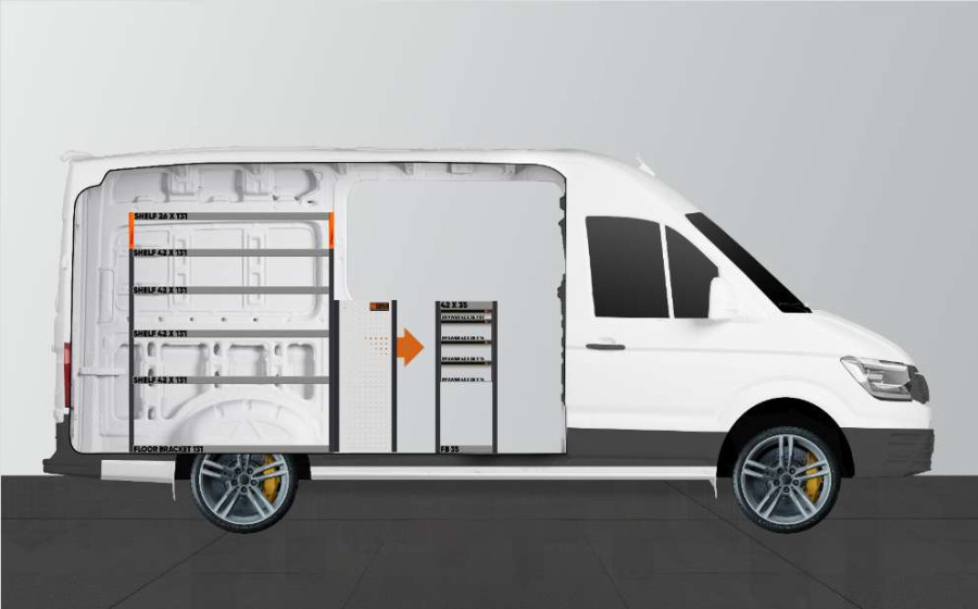 L'un des aménagements les plus populaires pour votre MAN TGE & Volkswagen Crafter L3. L’aménagement avec une profondeur de 420 mm dispose de trois tiroirs de différentes tailles afin de varier les possibilités de rangement. Les tiroirs s’ouvrent facilement depuis la porte latérale coulissante et peuvent supporter une charge uniforme de 35 kg / tiroir. L’espace étagère derrière le bloc tiroir est idéal pour ranger vos mallettes, outils ou consommables mais peut aussi se compléter avec notre système de bacs de rangement sur rails