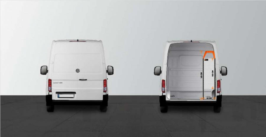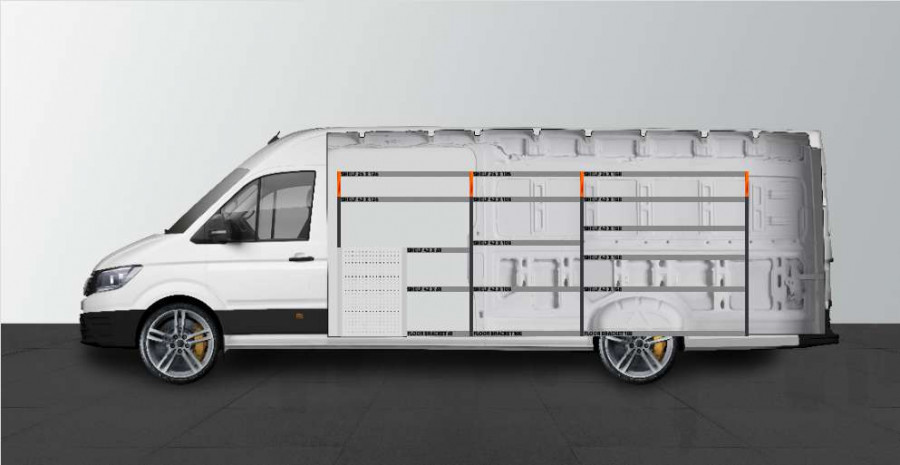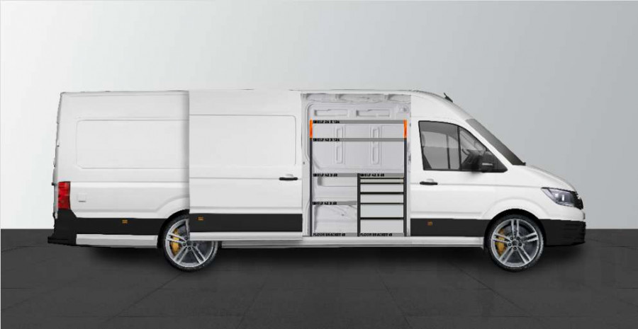 Cet aménagement offre un grand espace de rangement (tiroirs et étagères) pour Man TGE & VW Crafter L5 avec porte latérale gauche. (Retour/échange exclus)