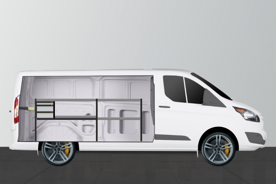 Une solution simplifiée parmi nos systèmes d’aménagement de véhicules de service qui rencontre un franc succès auprès des conducteurs de Ford Transit Custom L2 H1, grâce à ses tiroirs et étagères.