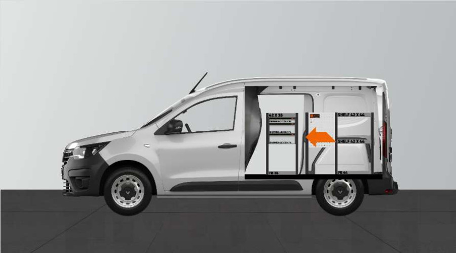 L'un des aménagements les plus populaires pour votre Dacia Dokker & Renault Express L1. L’aménagement avec une profondeur de 420 mm dispose de trois tiroirs de différentes tailles afin de varier les possibilités de rangement. Les tiroirs s’ouvrent facilement depuis la porte latérale coulissante et peuvent supporter une charge uniforme de 35 kg / tiroir. L’espace étagère derrière le bloc tiroir est idéal pour ranger vos mallettes, outils ou consommables mais peut aussi se compléter avec notre système de bacs de rangement sur rails