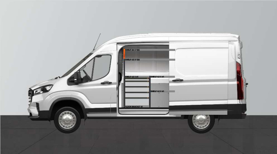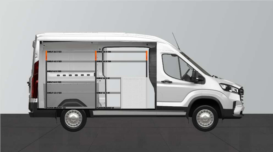 Voici l’un de nos systèmes les plus appréciés des conducteurs de Maxus e-Deliver 9 L2. Le chiffre 5 correspond au nombre de tiroirs. Cet aménagement offre également d’excellentes possibilités de rangement dans les étagères, non seulement pour vos mallettes à outils et vos outils électriques mais aussi pour vos petits objets. Vous disposez d’un bloc à tiroirs qui est tourné vers l’ouverture de la porte latérale. À l’arrière du bloc à tiroirs se trouve un panneau perforé pour augmenter les possibilités d’accrocher du matériel. Les tiroirs avec roulement à billes peuvent être complétés par nos inserts à tiroir pour structurer l’espace de façon optimale. Le panneau perforé peut être équipé de nos accessoires Smartbox, crochets, etc. afin d’optimiser votre espace de rangement.