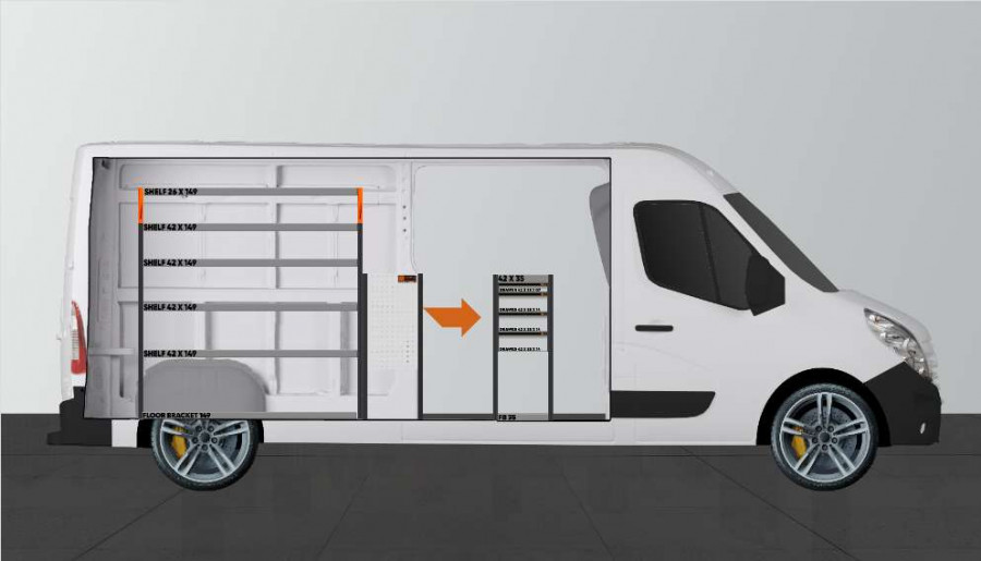 L'un des aménagements les plus populaires pour votre Opel Movano, Renault Master & Nissan NV400 L3. L’aménagement avec une profondeur de 420 mm dispose de trois tiroirs de différentes tailles afin de varier les possibilités de rangement. Les tiroirs s’ouvrent facilement depuis la porte latérale coulissante et peuvent supporter une charge uniforme de 50 kg / tiroir. L’espace étagère derrière le bloc tiroir est idéal pour ranger vos mallettes, outils ou consommables mais peut aussi se compléter avec notre système de bacs de rangement sur rails