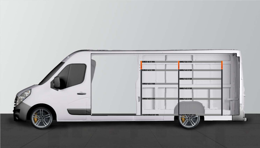 Un aménagement utilitaire pour Movano, Master et NV400 L4 H2 qui offre une bonne solution de rangement tant pour les mallettes d’outils et l’outillage électroportatif que pour les petites pièces. Cet aménagement, aux rayonnages de 420 mm de profondeur, permet d’accueillir parfaitement la plupart des mallettes d’outils actuellement disponibles sur le marché. En général, l’étagère du haut de 262,5 mm est complétée avec nos nouveaux bacs modulaires pour y ranger les petites pièces. Surtout, profitez bien du tableau à outils sur le panneau latéral.