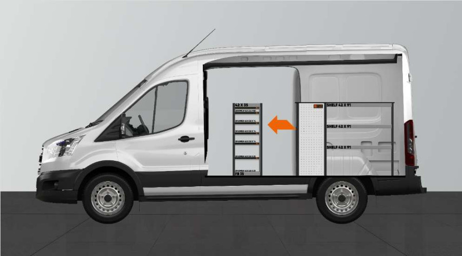 Aménagement utilitaire avec tiroirs facilement accessibles par la porte latérale de votre Expert, Jumpy, Vivaro, Scudo & ProAce L2.