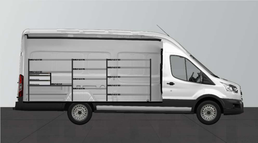 Une solution économique pour ceux voulant disposer de tiroirs sur rails à roulement à billes ainsi que de nombreuses étagères de rangement pour Ford Transit L4 H3. Cet aménagement, aux rayonnages de 420 mm de profondeur, permet d’accueillir parfaitement la plupart des mallettes d’outils actuellement disponibles sur le marché. Les tiroirs peuvent être complétés avec nos nouveaux organiseurs. L’idéal pour tenir vos petites pièces en ordre.