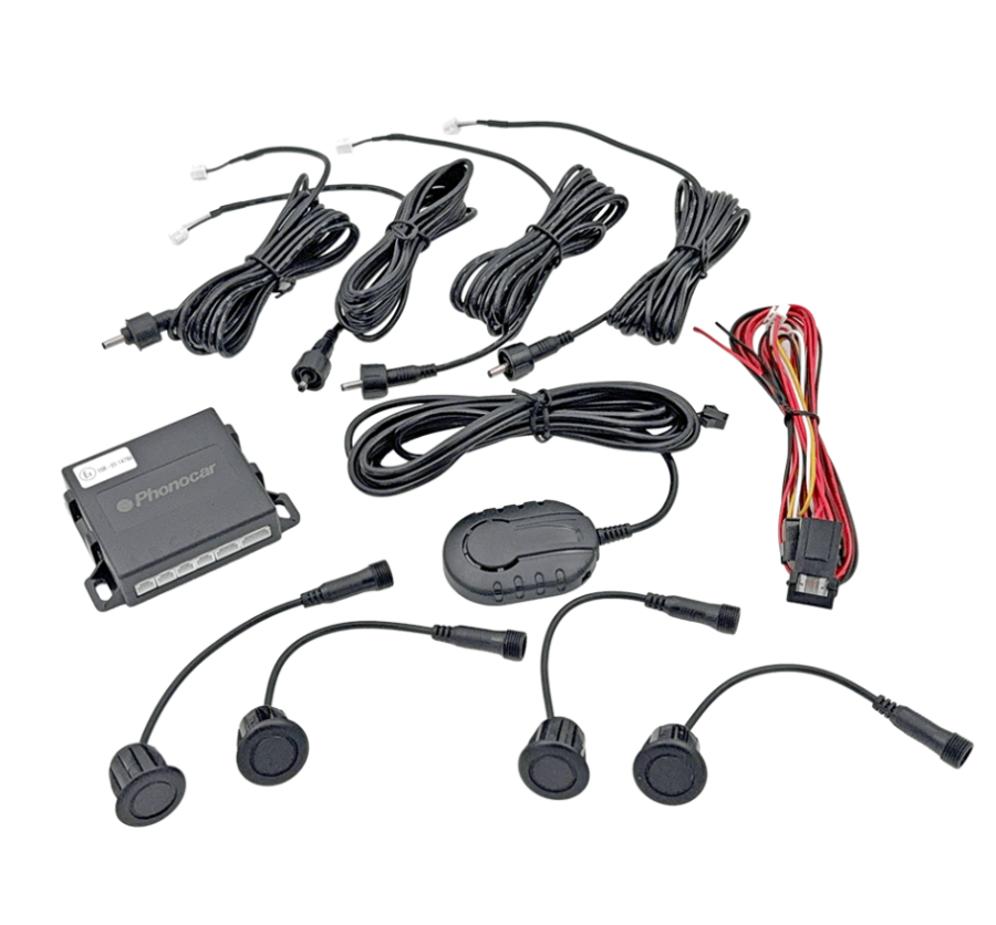 Kit comprenant quatre capteurs de stationnement, une alarme Summer, des câbles et des instructions de montage. Le système est conçu pour un montage sur le pare-chocs avant ou arrière du véhicule. Un montage à l’avant du véhicule requiert un interrupteur A8 (disponible en option) pour garantir un fonctionnement correct.