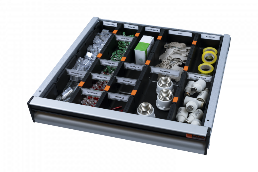 Diese Einsätze können Sie auch mit Etiketten und weiteren Trennwänden ergänzen