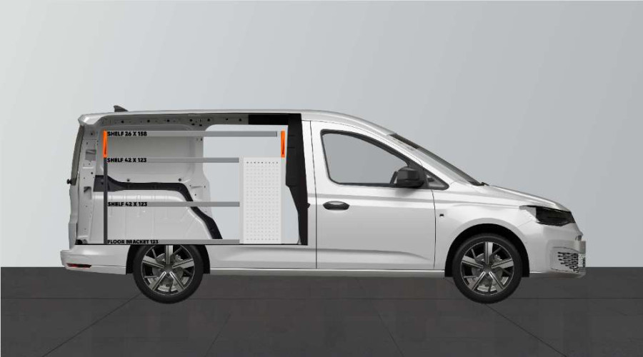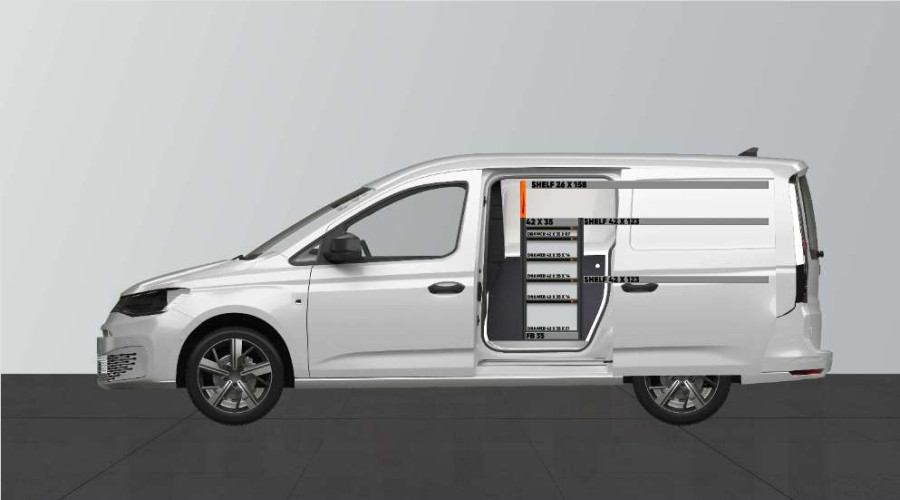 Dies ist eines der beliebtesten Systeme für den VW Caddy Cargo & Ford Connect L2 mit Seitentür auf der Seite der Einrichtung. Die Einrichtung bietet gute Aufbewahrungsmöglichkeiten für Werkzeugtaschen/-koffer, Maschinen und Kleinteile. Sie umfasst eine Schubladeneinheit mit 5 Schubladen in verschiedenen Größen, damit jeder Ausrüstungsgegenstand seinen Platz erhält. Hinter den Schubladen befindet sich eine Werkzeugtafel, die zusätzliche Aufhängungsmöglichkeiten im Fahrzeug bietet. Die Schubladen auf Kugellagerschienen werden häufig durch unsere neuen Schubladeneinsätze und Trennwände ergänzt, um maximale Ordnung und Übersichtlichkeit zu gewährleisten. Die Regalwand wird gerne auch durch unsere Smartboxen ergänzt, um den Stauraum zu maximieren.