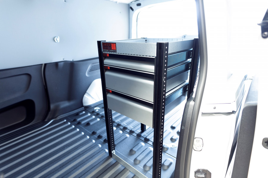 Mit der Serie Work System V-LS3 bieten wir Ihnen ein Fahrzeugregal für Berlingo, Combo, Proace City & Partner L2, bestehend aus einem Regal mit drei Schubladen, ausgestattet mit Kugellagerschienen.