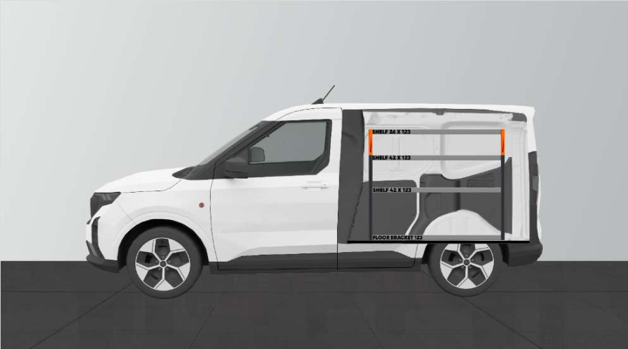 Mit unserer Fahrzeugeinrichtung BASE42 erhalten Sie großzügigen Stauraum in Ihrem Ford Courier L1.