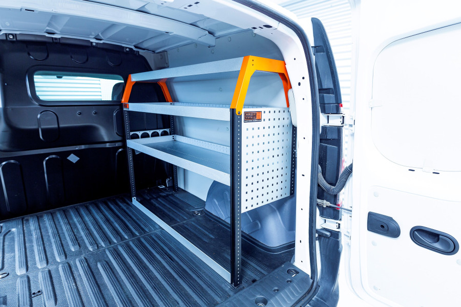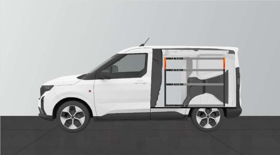 Eine Fahrzeugeinrichtung für Ihren Ford Courier L1, die gute Aufbewahrungsmöglichkeiten für Werkzeugtaschen/-koffer, Maschinen und Kleinteile bietet. Die Regalböden der Einrichtung haben eine Tiefe von 420 mm, dank derer sich die meisten auf dem Markt erhältlichen Werkzeugtaschen/-koffer problemlos verstauen lassen. Das obere Regal mit 262,5 mm wird oft durch unsere Modulboxen ergänzt, um Platz für die Aufbewahrung von Kleinteilen zu schaffen. Vergessen Sie nicht, die Werkzeugtafel der Regalwand zu nutzen.