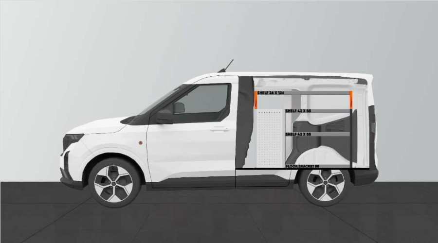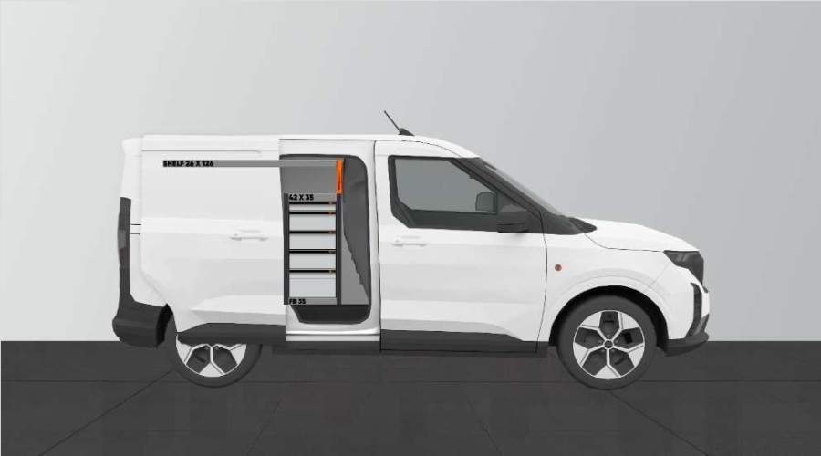 Dies ist eines der beliebtesten Systeme für den Ford Courier L1 mit Seitentür auf der Seite der Einrichtung. Die Einrichtung bietet gute Aufbewahrungsmöglichkeiten für Werkzeugtaschen/-koffer, Maschinen und Kleinteile. Sie umfasst eine Schubladeneinheit mit 5 Schubladen in verschiedenen Größen, damit jeder Ausrüstungsgegenstand seinen Platz erhält. Hinter den Schubladen befindet sich eine Werkzeugtafel, die zusätzliche Aufhängungsmöglichkeiten im Fahrzeug bietet. Die Schubladen auf Kugellagerschienen werden häufig durch unsere neuen Schubladeneinsätze und Trennwände ergänzt, um maximale Ordnung und Übersichtlichkeit zu gewährleisten. Die Regalwand wird gerne auch durch unsere Smartboxen ergänzt, um den Stauraum zu maximieren.