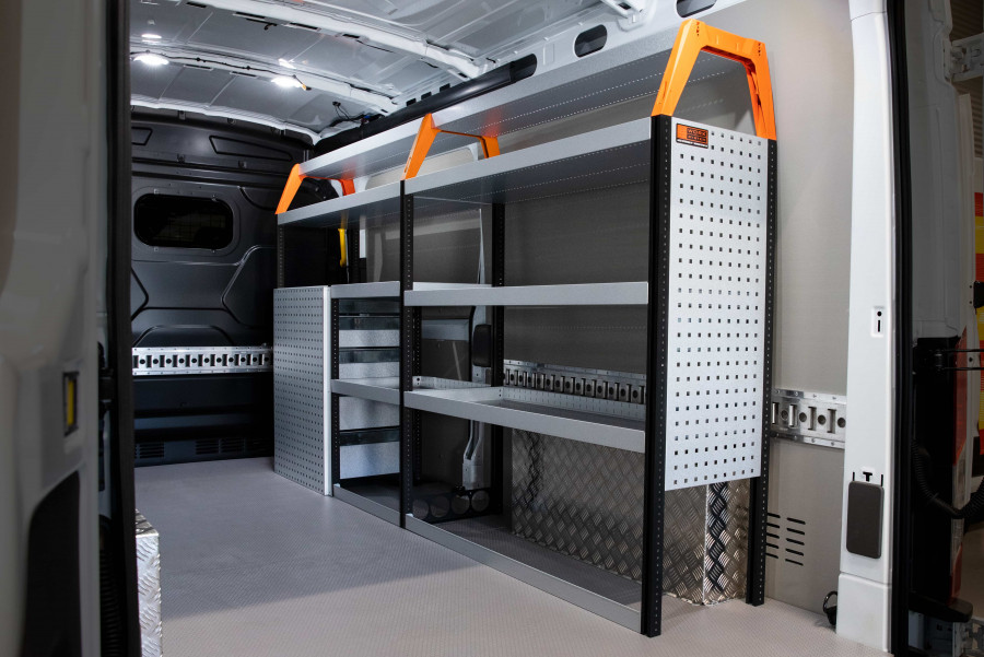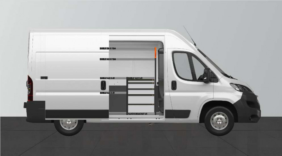 Dies ist eines der beliebtesten Systeme für den Proace Max, Peugeot Boxer, Fiat Ducato, Citroen Jumper 2010- & Opel Movano 2021- L2 mit Seitentür auf der Seite der Einrichtung. Die Einrichtung bietet gute Aufbewahrungsmöglichkeiten für Werkzeugtaschen/-koffer, Maschinen und Kleinteile. Sie umfasst eine Schubladeneinheit mit 5 Schubladen in verschiedenen Größen, damit jeder Ausrüstungsgegenstand seinen Platz erhält. Hinter den Schubladen befindet sich eine Werkzeugtafel, die zusätzliche Aufhängungsmöglichkeiten im Fahrzeug bietet. Die Schubladen auf Kugellagerschienen werden häufig durch unsere neuen Schubladeneinsätze und Trennwände ergänzt, um maximale Ordnung und Übersichtlichkeit zu gewährleisten. Die Regalwand wird gerne auch durch unsere Smartboxen ergänzt, um den Stauraum zu maximieren.