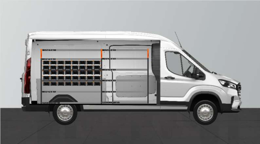 RACK ist eine neue, branchenführende Fahrzeugeinrichtung für den Maxus e-Deliver9 L3. Sie eignet sich perfekt für alle, die eine gute Aufbewahrungsmöglichkeit für ihr Sortiment benötigen, z. B. Schrauben, Kupplungen, Bolzen, Bohrer usw. Die Einrichtung wurde um insgesamt 40 unserer neuen unterteilbaren Modulboxen erweitert. Die Modulboxen werden auf fest montierten Schienen herausgezogen, was einen einfachen Zugang ermöglicht. Die Front der Modulboxen ist so konzipiert, dass sie optimale Zugänglichkeit bietet. Die Kästen können durch ein transparentes Fenster und Querzwischenwände ergänzt werden, die alle 60 mm eingeschoben werden können.