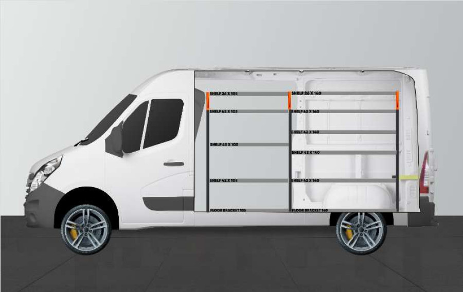 Eine Fahrzeugeinrichtung für Ihren Opel Movano, Renault Master och Nissan NV400, die gute Aufbewahrungsmöglichkeiten für Werkzeugtaschen/-koffer, Maschinen und Kleinteile bietet. Die Regalböden der Einrichtung haben eine Tiefe von 420 mm, dank derer sich die meisten auf dem Markt erhältlichen Werkzeugtaschen/-koffer problemlos verstauen lassen. Das obere Regal mit 262,5 mm wird oft durch unsere Modulboxen ergänzt, um Platz für die Aufbewahrung von Kleinteilen zu schaffen. Vergessen Sie nicht, die Werkzeugtafel der Regalwand zu nutzen.