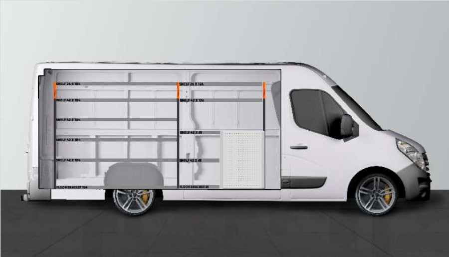 Dies ist eines der beliebtesten Systeme für den Opel Movano, Renault Master & Nissan NV400 L3 mit Seitentür auf der Seite der Einrichtung. Die Einrichtung bietet gute Aufbewahrungsmöglichkeiten für Werkzeugtaschen/-koffer, Maschinen und Kleinteile. Sie umfasst eine Schubladeneinheit mit 5 Schubladen in verschiedenen Größen, damit jeder Ausrüstungsgegenstand seinen Platz erhält. Hinter den Schubladen befindet sich eine Werkzeugtafel, die zusätzliche Aufhängungsmöglichkeiten im Fahrzeug bietet. Die Schubladen auf Kugellagerschienen werden häufig durch unsere neuen Schubladeneinsätze und Trennwände ergänzt, um maximale Ordnung und Übersichtlichkeit zu gewährleisten. Die Regalwand wird gerne auch durch unsere Smartboxen ergänzt, um den Stauraum zu maximieren.