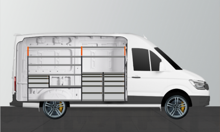På jakt efter en inredning med mycket lådor? Har du dessutom stora krav? Då är detta alternativet för dig och din Ford Transit L4H3. Totalt får du här 13 st lådor på kullagerskenor. Inredningen ger bra förvaringsmöjligheter för såväl dina verktygsväskor, maskiner som ditt mindre sortiment. Du får en lådhurts med lådor av varierade storlekar för att ge var sak sin plats. Lådorna på kullagerskenor är populära att komplettera med våra nya sortimentlådor för att skapa bästa struktur. Fördelad lastvikt i lådorna på kullagerskenor är 35kg/st. Lådornas innermått är (mm) B-579, D-387, H-60, H-130 samt H-200.